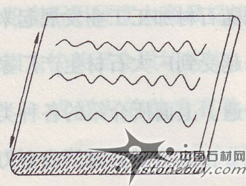 6. 細磨、水磨拋光。依次用60#、120#、220#、320#、500#、600#、800#、1500#、拋光磨片將所要磨的邊拋光。用500#以前四個型號的磨片水磨時要按圖三所標的箭頭方向來回磨邊,來回磨邊的距離要長。用后四個型號的磨片拋光時應(yīng)按圖四所標的箭頭方向來回運動拋光。按此方法打磨拋光出來的產(chǎn)品http://www.stonebuy.com/sample/形狀、光度都很好。打磨花崗巖的邊最好500#以前的四個磨片用磨頭代替手工打磨,這樣可以消除磨邊上的波浪。