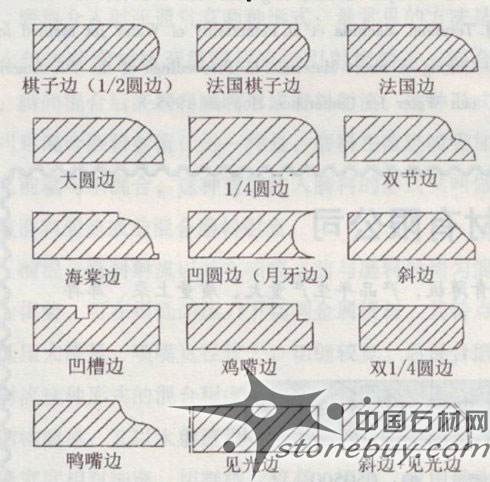 所謂磨邊,就是將板材的一條邊或幾條邊磨成具有幾何形狀的一種石材http://www.stonebuy.com/加工工藝。石材http://www.stonebuy.com/加工中常見的磨邊稱謂見下表: