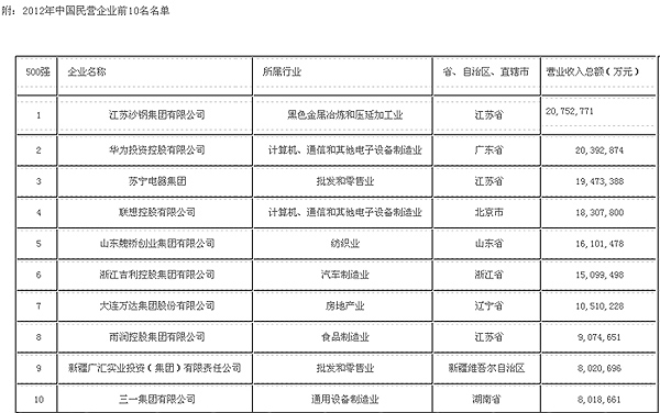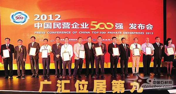 由全國工商聯主辦的2012中國http://www.stonebuy.com民營企業http://www.stonebuy.com/enterprise/500強發布會于8月30日在北京萬達蘇菲特酒店召開,發布會揭曉了2012中國http://www.stonebuy.com民營企業http://www.stonebuy.com/enterprise/500強名單。江蘇沙鋼集團以2075億元營收總額排名第一,華為、蘇寧、聯想控股及山東魏橋分列二至五位。廣匯集團榜上有名,再次榮獲中國http://www.stonebuy.com民營企業http://www.stonebuy.com/enterprise/500強稱號,位居第9。此次民企500強入選門檻再創新高,達65.69億元,總收入達93072.37億元。