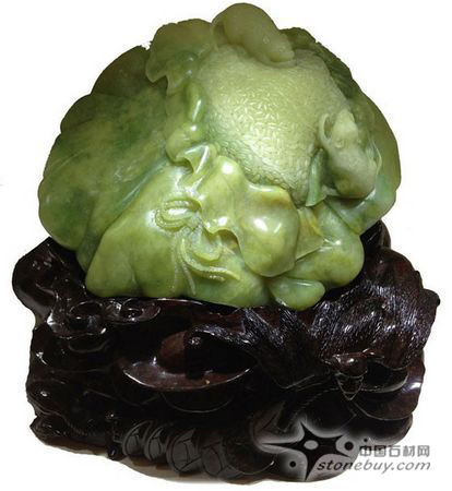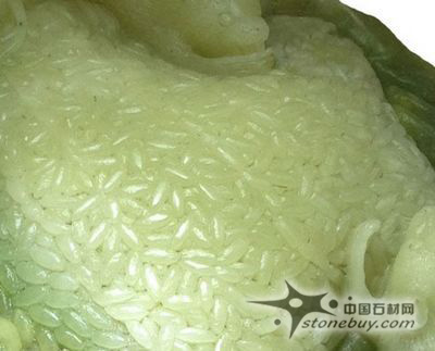作品使用中國http://www.stonebuy.com五大名石之一廣綠玉的白硬石制作而成,石材http://www.stonebuy.com/白硬石一般以白色為主,此石材http://www.stonebuy.com/呈現兩種不同的顏色,是白硬石之中十分罕見的。作者利用玉石的白色色彩使用圓雕手法巧色出兩白鼠以及大米,(粒粒大米大小均勻、雪白色與現實的沒什么分別)。米黃色部分刻劃了一個布袋,布袋裝有大米,白鼠在吃大米,突出了作品的色彩分配合理,雕工之精細,題材的創新,都十分先前。作品底座是利用黑檀木制作的,底座雕有元寶以及銅錢,襯托作品,突出主題。此作品在參加2012年深圳文博展中榮獲中國http://www.stonebuy.com工藝美術文化創意獎金獎。