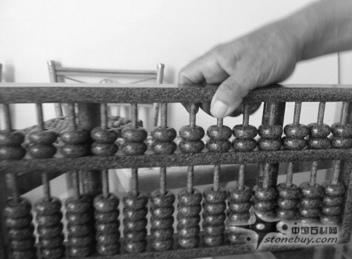 這個青石的算盤,是邱師傅覺得唯一成功的一個。這個13檔的算盤,不論是寬度、長度還是厚度,以及珠子的圓潤程度,珠子的個頭,以及上下檔之間的位置,都與標準的算盤一模一樣。