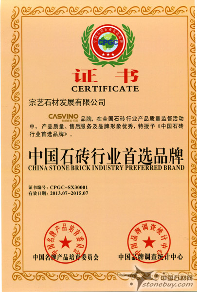 由意大利卡斯維諾家族和宗藝集團呂氏家族共同打造的頂級石磚品牌——卡斯維諾再傳喜訊,經過中國http://www.stonebuy.com名牌產品http://www.stonebuy.com/sample/培育委員會近一年的考察,卡斯維諾石磚在品牌形象、產品http://www.stonebuy.com/sample/設計、售后服務等方面均優秀,被授予“中國http://www.stonebuy.com石磚行業首選品牌”。
