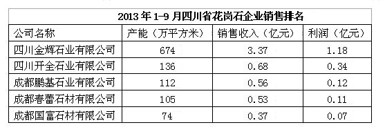 據四川省石材http://www.stonebuy.com/協會統計,2013年1-9月、四川省內規模以上花崗石石材http://www.stonebuy.com/生產、經銷企業http://www.stonebuy.com/enterprise/已完成銷售收入80.32億元、實現利稅32.13億元。預計全年可實現銷售100億元以上。