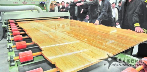 3月24日,羅甸縣一石材http://www.stonebuy.com/企業http://www.stonebuy.com/enterprise/一期投資1億元開發的米黃色大理石第一塊板材緩緩流下拋光生產線,其平整度、厚薄度、光亮度令在場的來自臺灣等地石材http://www.stonebuy.com/經銷商十分滿意。羅甸米黃色大理石資源豐富,目前已有三家企業http://www.stonebuy.com/enterprise/進駐開發。