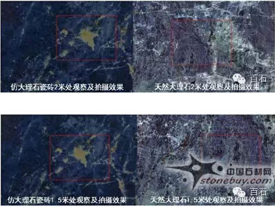 實驗以同樣命名"藍寶石"的天然大理石和仿大理石為例,用模擬人眼的數碼相機,在四個不同的距離點拍攝,并對比拍攝效果。結果發現,雖然在較遠距離觀看時,兩款產品http://www.stonebuy.com/sample/的視覺效果大同小異,但在近距離的視角下,天然大理石呈現出豐富而細膩的立體效果,仿大理石的觀感則變得模糊不清。