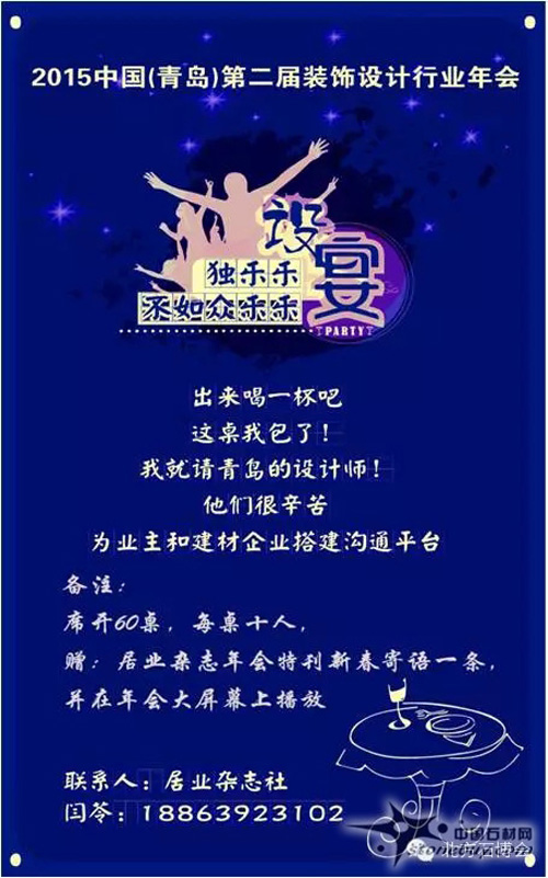 2015已成為歷史,2016你準備好了嗎?1月14日,“2015中國http://www.stonebuy.com(青島)第二屆裝飾設計行業年會”將在香格里拉酒店舉行,年會將延續去年的精髓,繼續以“設計創造價值”為目的,邀約國內知名設計大咖、大青島地區設計師,以及家居建材行業大佬、精英,共同探討 “設計驅動產業升級”的家居建材行業機遇與共贏模式;“在這里沒有競爭,都是行業的合作伙伴,打開內心深處的那道門,攜手同行、抱團取暖”。年會以青島地區為主; 以設計師、建材商家聯誼年會為核心,以大師演講、開啟智慧、全員參與、自娛自樂為根本。