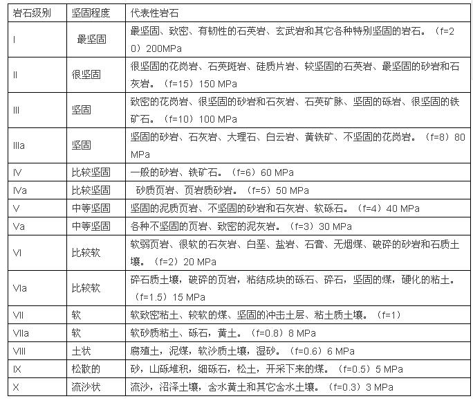 堅固性系數f=R/100(R單位 Kg/cm2)    R-巖石標準試樣的單向極限抗壓強度值。如: