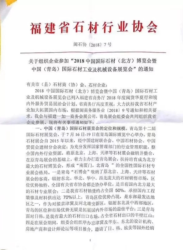 福建http://www.zongyi.com.cn/是石材http://www.stonebuy.com/大省,其石材http://www.stonebuy.com/產業快速良性發展與政府的支持和引導是密切相關。面對石材http://www.stonebuy.com/產業的新困境和新商機,福建http://www.zongyi.com.cn/政府及協會快速應變,看準北方市場http://www.stonebuy.com/enterprise/FuJian/QuanZhouShi.html發展前景和空間,為推動福建http://www.zongyi.com.cn/石材http://www.stonebuy.com/企業http://www.stonebuy.com/enterprise/快速轉型級,拓展國內石材http://www.stonebuy.com/市場http://www.stonebuy.com/enterprise/FuJian/QuanZhouShi.html和龐大的家裝市場http://www.stonebuy.com/enterprise/FuJian/QuanZhouShi.html,福建http://www.zongyi.com.cn/石材http://www.stonebuy.com/行業協會將2018中國http://www.stonebuy.com國際石材http://www.stonebuy.com/北方博覽會暨第十二屆青島國際石材http://www.stonebuy.com/工業及機械http://www.stonebuy.com/machine/設備展覽會已列入福建http://www.zongyi.com.cn/省商務廳2018年度閩貨華夏行和境內外服務貿易http://www.stonebuy.com/trade/展洽會計劃。福建http://www.zongyi.com.cn/省商務廳高度重視,將大力扶持福建http://www.zongyi.com.cn/省石材http://www.stonebuy.com/產業,加大拓展國內石材http://www.stonebuy.com/。福建http://www.zongyi.com.cn/省石材http://www.stonebuy.com/行業協會2018年4月下發閩石協(2018)7號紅頭文件,由福建http://www.zongyi.com.cn/石材http://www.stonebuy.com/行業協會及福建http://www.zongyi.com.cn/一加一商務會展公司,共同組織福建http://www.zongyi.com.cn/省石材http://www.stonebuy.com/企業http://www.stonebuy.com/enterprise/參加2018中國http://www.stonebuy.com國際石材http://www.stonebuy.com/北方博覽會暨第十二屆青島國際石材http://www.stonebuy.com/工業及機械http://www.stonebuy.com/machine/設備展覽會,為鼓勵大家參展,福建http://www.zongyi.com.cn/政府將給予相應政策補貼扶持,以振興福建http://www.zongyi.com.cn/省石材http://www.stonebuy.com/企業http://www.stonebuy.com/enterprise/在中國http://www.stonebuy.com北方的石材http://www.stonebuy.com/市場http://www.stonebuy.com/enterprise/FuJian/QuanZhouShi.html地位。