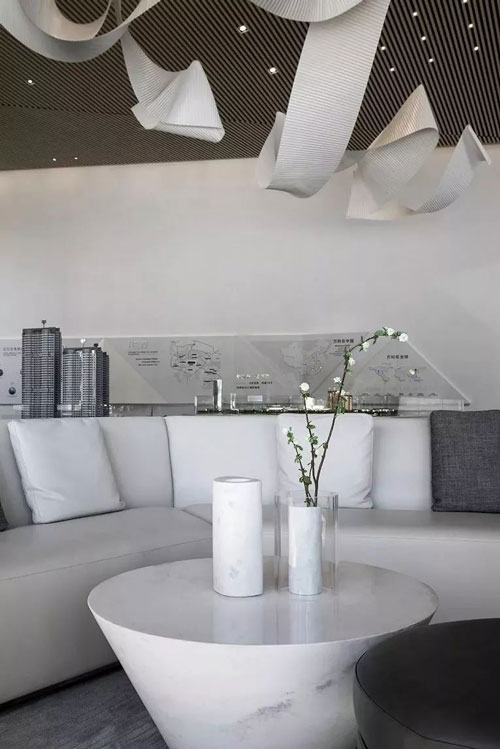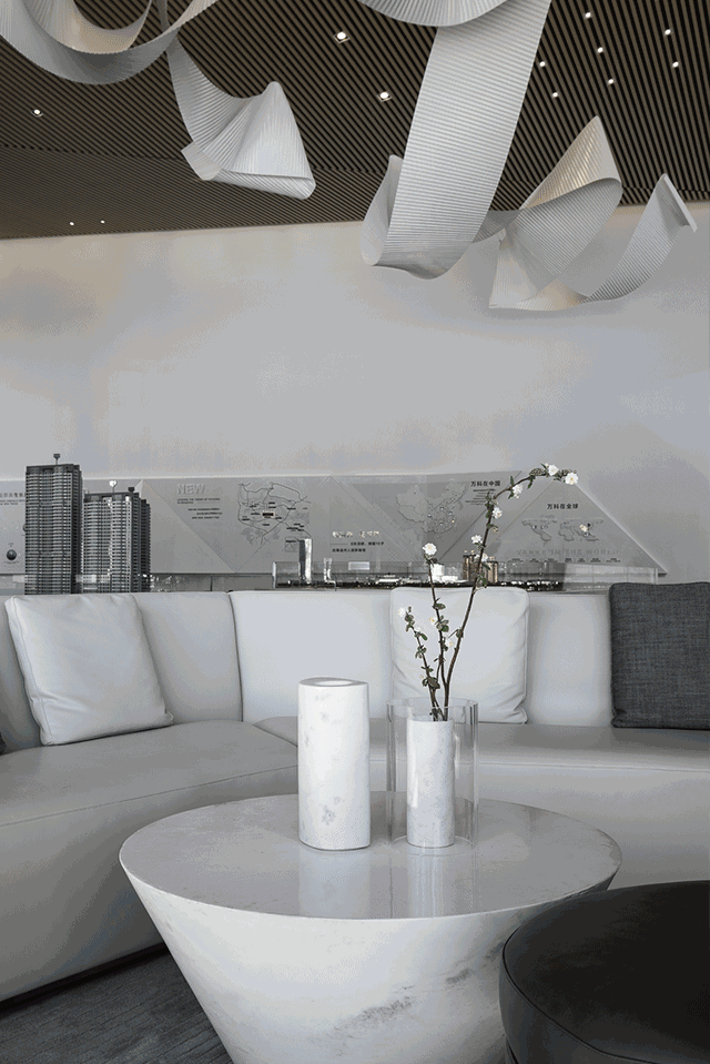 為了接近這個理想,在溫州萬科翡翠天地銷售體驗中心,樂尚設計顛覆常規的售樓中心的設計模式,以極簡的語匯、減法的手筆、充滿當代藝術氣息的元素,打造了一個靜美的生活藝術館。這里,沒有刻意的自我表現,沒有乏味的多余矯飾,于簡雅質樸中,彰顯典雅有力的存在感。