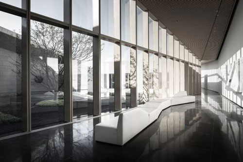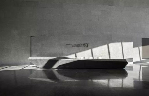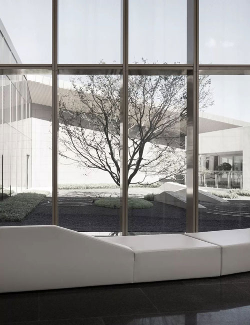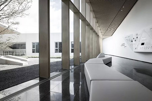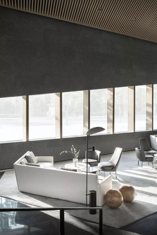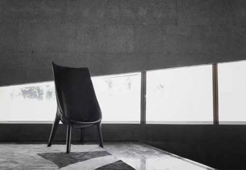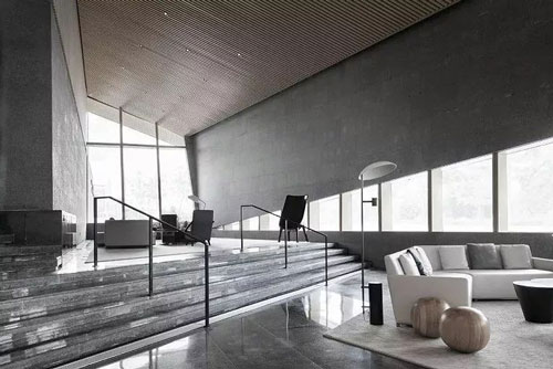 步入館內,一片清水混凝土墻面下,是棱角分明的石材http://www.stonebuy.com/臺面,簡潔明凈、毫無它飾。接待區右側挑高的落地玻璃,向自然借景,光影在室內自在游走,一種靜謐而無垠廣闊的空間感悄然生發,自然與靈魂得以展開一場細膩而自在的對話。