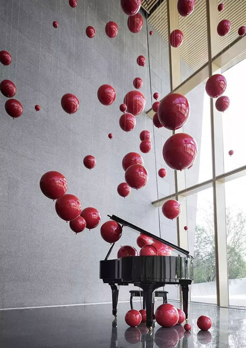 落地窗旁,輕盈的紅色氣球以冉冉上升的姿態,在傾灑的光影下,伴隨著柔和的曲調盈盈飄動,打破了灰色基調的視覺塊面。空氣中彌漫著沉浸式的濃郁情愫、微醺的浪漫,調動著觀者的感官。