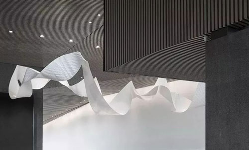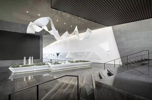 隨著接待區左側階梯往下,是空間沙盤區與洽談區的所在。空間集合著冷靜的線性元素,縱向與橫向木制線條交織組合,呈現出一個富有旋律的簡潔空間。抽象的折紙藝術裝置,垂墜于空中,似輕盈絲滑的綢緞,與通體透明的沙盤區相映相生,一剛一柔,在無言的空間中激蕩起跳躍的音律,碰撞出空間的深度。