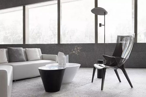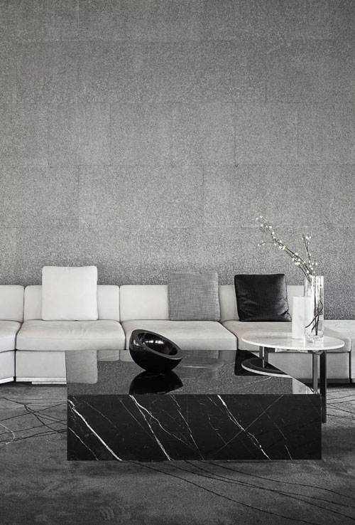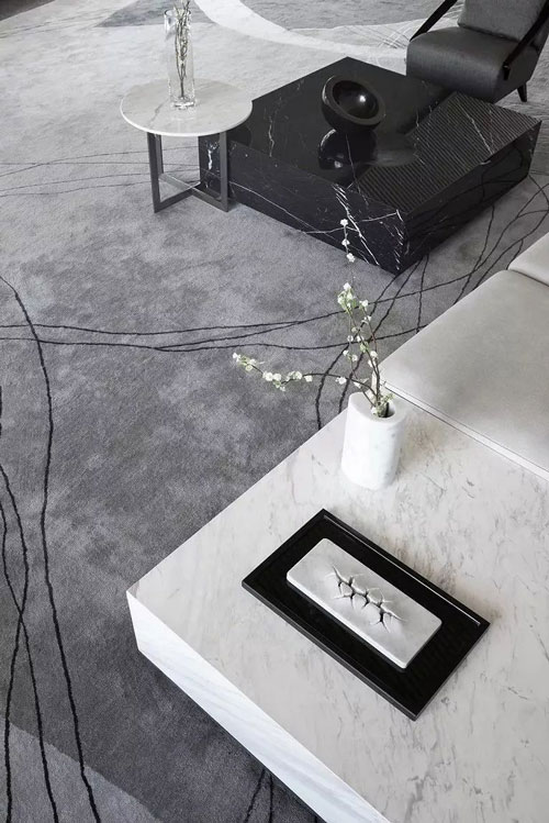 家具造型呼應建筑體量的幾何線條感,純白簡灰的極簡色調,與通透的理石臺面、黑色的靜穆搭配,呈現一種堅硬與柔軟并存、光潔與粗重并呈的特殊質感。纖柔的花藝同樣以極少的藝術寂靜地存在,編織出空靈樸拙的安靜感與美。