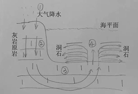 4、飽和的地下水涌出,形成熱泉并且溫度降低,碳酸鈣的溶解度下降并沉淀下來形成洞石。