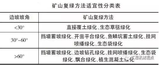 礦山復綠方法眾多,在實際應用中需要根據治理礦山的具體情況選用不同的治理方法,采用多種礦山復綠方法進行組合,以期實現最佳綠化效果。針對不同類型的邊坡,可選用不同的復綠方式,下表僅供參考。