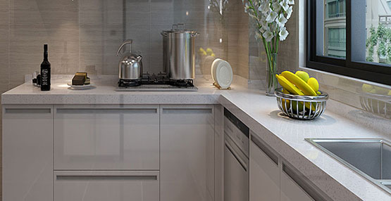 石英石板材表面光如鏡面,這是因為石英石廠家在生產中有水磨拋光程序。水磨拋光是經過多道2000目水磨頭經高壓、高轉速研磨的成果,是其它手持工具所不能及的。經角磨機打磨后導致泛白現象的出現,是因為石英石板材的基體是白色的,在接縫打磨過程中,破壞了板材表面的光澤及色澤,露出了白色的基體,這也是為什么板材顏色越深接縫處泛白現象越明顯的原因。