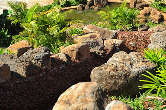 火山巖的天然孔洞,使其具備獨特的呼吸功能,就是在雨天可以利用孔洞將水分吸足,晴天在陽光的照射下,使水分慢慢的釋放來調解周邊空氣的溫度。此功能多適用于步行街、廣場、特別是花、草、樹木的周邊,使其天空的雨水滲入地下,與地下的水分溝通,保證植物有充分的水分,并且周邊也沒有陽光的強烈烘烤。