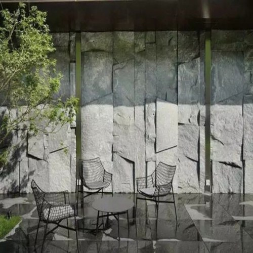 蘑菇石的結(jié)構(gòu),本文以五蓮花蘑菇石為例,中間為凹凸的自然面,呈現(xiàn)出石質(zhì)自然清晰的紋理花色,四邊為修整的平整四邊,寬度通常在20MM左右。