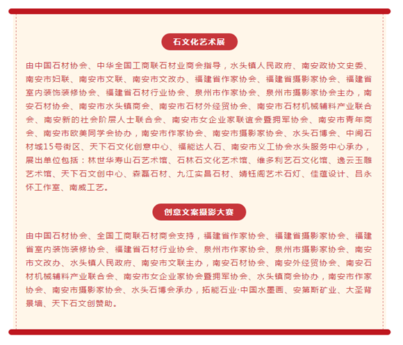 創意文案攝影大賽獎項分為“創意微故事”類、“創意宣傳文案”類、多媒體類、攝影類,每個類別分設一、二、三等獎和優秀獎。其中,一等獎各1名,每名獎金10000元+價值19888元背景畫一幅+獎杯、證書;二等獎各3名,每名獎金3000元+價值5888元天然石畫+獎杯、證書;三等獎各6名,每名獎金1000元+價值1888元的石伴手禮+獎杯、證書;優秀獎各15名,每名獎金200元+價值399元石伴手禮+證書。此外,“創意微故事”類和“創意宣傳文案”類入選各30名,攝影類入選50名,多媒體類入選10名,每名獎金100+證書;網絡人氣獎各三名,獎金分別為第一名500元、第二名300元、第三名200元+證書。