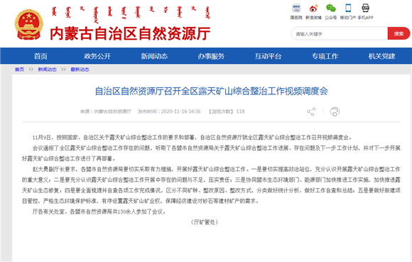 近日,按照國家、自治區關于露天礦山綜合整治工作的要求和部署,內蒙古自治區自然資源廳就全區露天礦山綜合整治工作召開視頻調度會。