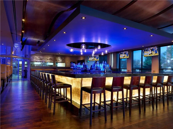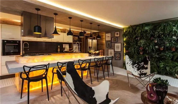 ▲透光石吧臺,賦予了空間更多的可能性。天花的金色板通過燈光的作用反射出斑駁的光影。