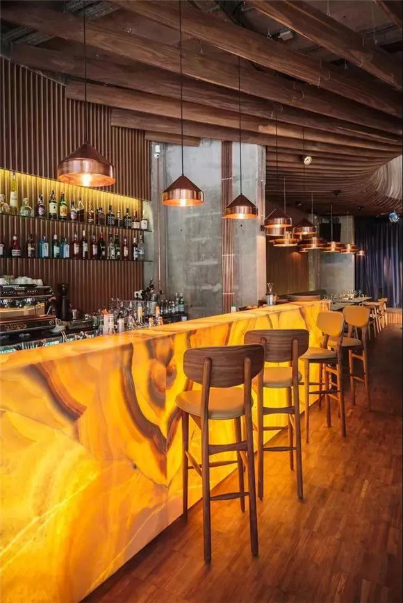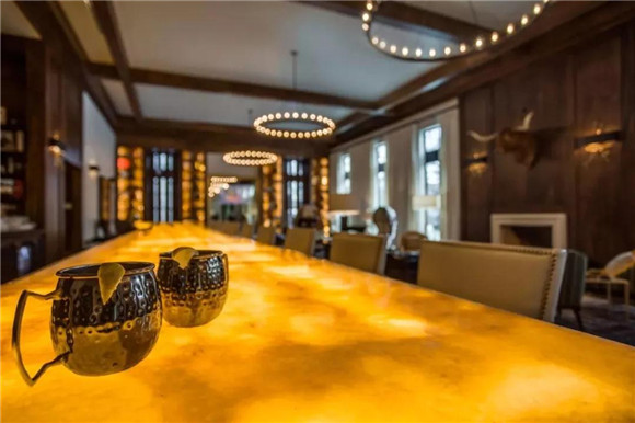 墻面、地面、吧臺、柜臺、室內間隔斷、天花板、衛生間等等,透光石的身影其實非常常見。經透光石加入的空間,好像有一股神韻一般,妙不可言。