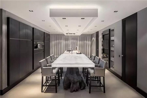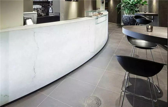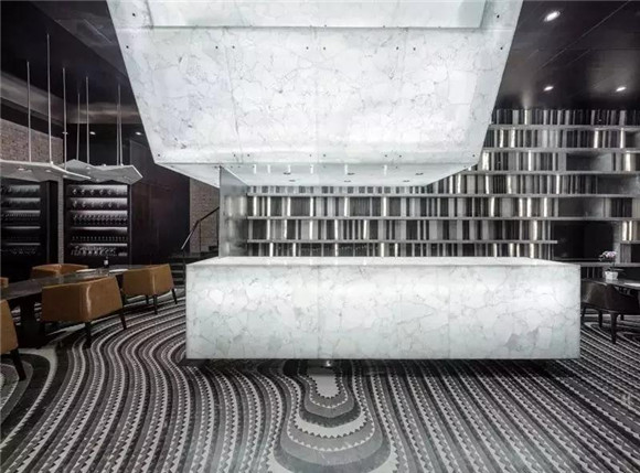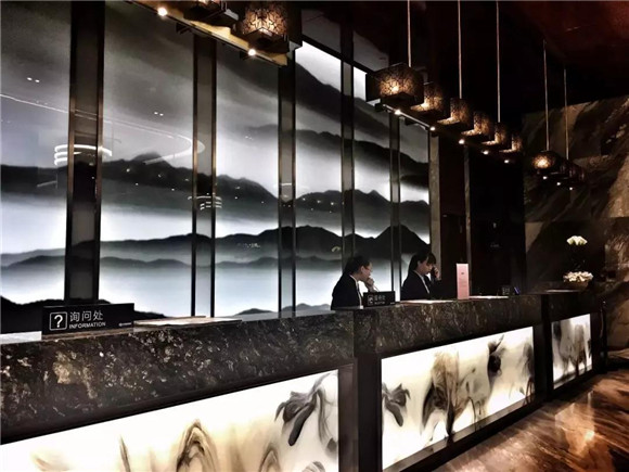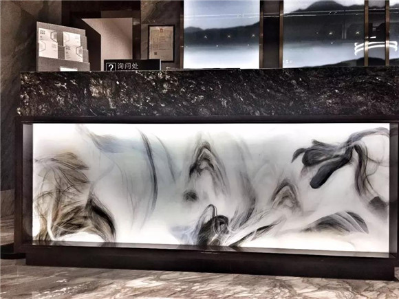 色澤潔白的透光石柜臺,一眼看去,表面隨意舞動著水墨,看似獨立分明卻又相互融合,創造出獨一無二的境界,而且與大理石的巧妙配合,映襯出飄逸灑脫的空間氛圍。