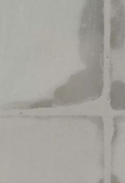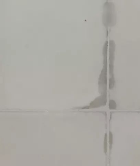 水滲透的痕跡顏色較淺、邊界不清,滲水的縫隙處仔細觀察會發現膠面上有細小的,像頭發絲兒那么細的裂縫,水就是從那個裂縫滲進去的。