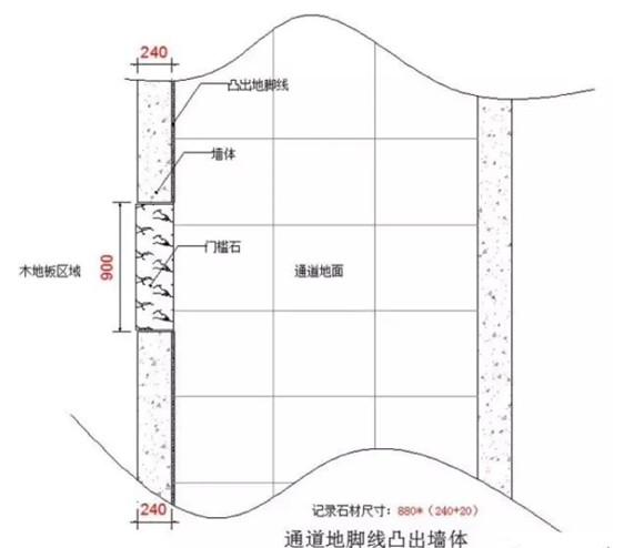 ▼第二個房門(圖2是一個墻面240厚,地腳線貼平墻體,所以考慮的是地磚需要嵌進墻5mm,另外一邊就是比墻體出10mm,等于草稿記錄880*240+5,880是900已經(jīng)減去20)