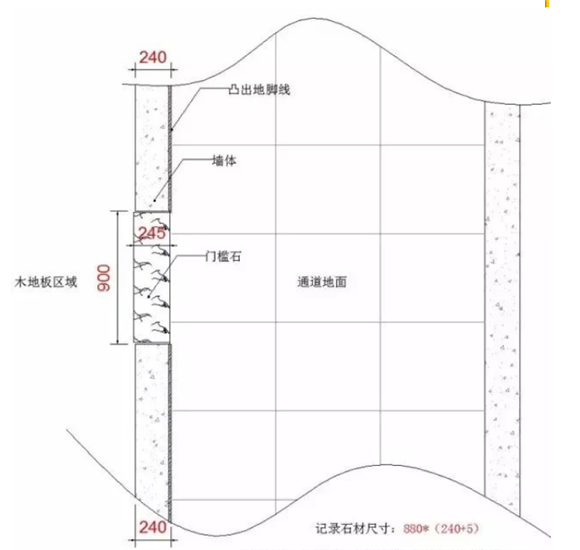 ▼第一個(這是一個通道和房間相連的門檻,地腳線是凸出來的樣式,測量記錄的尺寸是:880*(240+20),門洞的寬原尺寸是900減去了20是方便安裝時有空位,因為安裝房門時還可以遮住。
