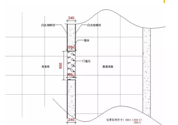 ▼第三個通道(圖3是一個墻面240厚,兩邊安裝師傅已經(jīng)鋪好了地磚,中間留出的一個空地方做門檻石,那就需要測量兩頭的尺寸然后再減去2mm,作為安裝移動空間,大理石不是木頭,剛好和大一點都安裝不了。這個門檻石大小頭,記錄尺寸是880*260(255)-2.)。