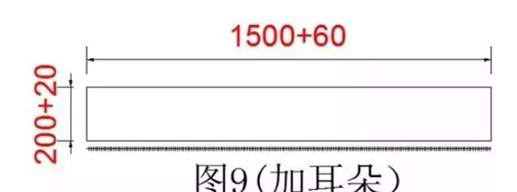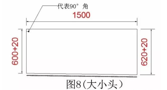 ▼第2個大小窗臺(圖8是一個大小頭的窗臺,600,620和1500是水泥的數(shù)據(jù),加20是加厚磨邊的數(shù)據(jù),記得畫草稿時,一定要記上90°的位置,要不以后搞反反向就安裝不了)