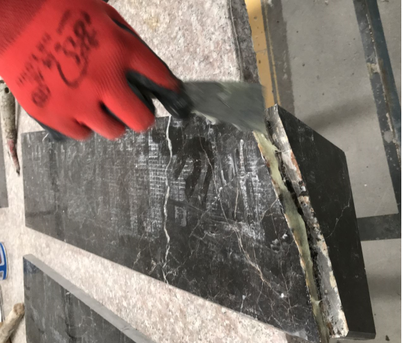 大理石之所以斷裂就是因為有裂縫,裂縫中天生就藏有泥等污物,加工時水分又會進入到裂縫中,如果補膠時不象圖12那樣清理斷裂處的臟物,干燥里面水分的話,膠是不可能與大理石之間形成高強度的粘接力的,補過膠的板二次斷裂也就很正常了。