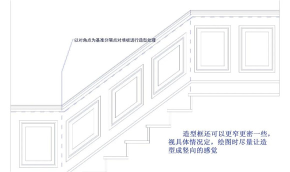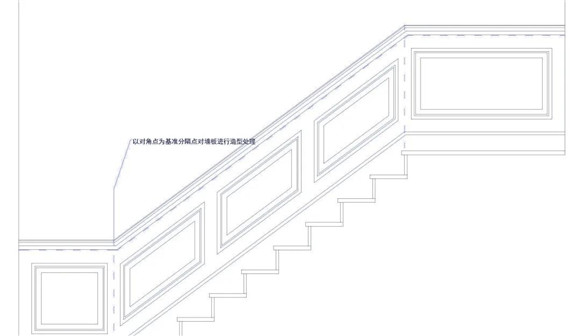 根據(jù)樓梯的步數(shù)、斜面長(zhǎng)度來(lái)確定墻板的大小比例關(guān)系。一般,在樓梯斜面長(zhǎng)度夠的情況下,墻裙在樓梯側(cè)面的表現(xiàn)形式應(yīng)該是長(zhǎng)形的,也就是斜面墻板扣線造型的長(zhǎng)度尺寸在視覺(jué)上大于墻板扣線造型的高度尺寸。