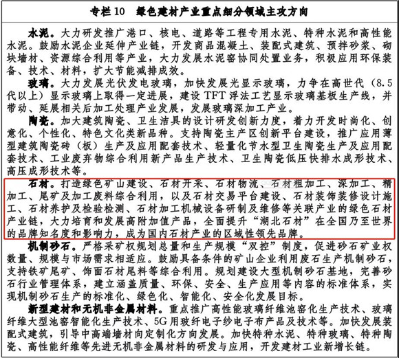 值得關(guān)注的是,在綠色建材產(chǎn)業(yè)重點(diǎn)細(xì)分領(lǐng)域主攻方向中,對(duì)石材http://www.stonebuy.com/和機(jī)制砂發(fā)展方向做出說明: