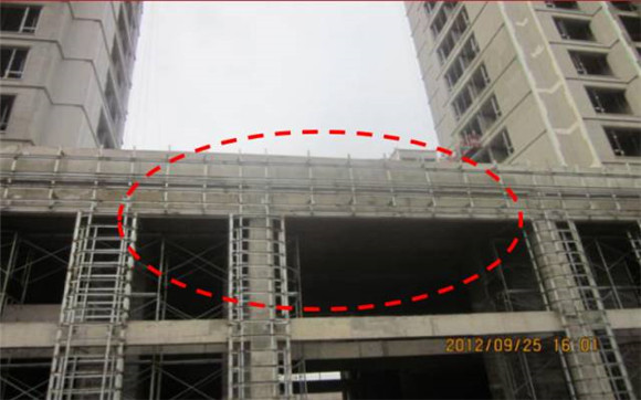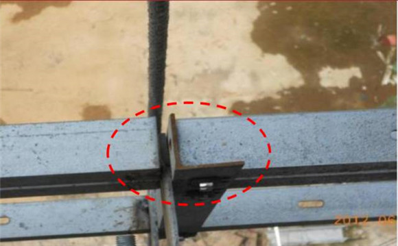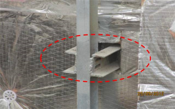 現(xiàn)場問題:懸挑槽鋼與主龍骨應(yīng)三面焊, 現(xiàn)僅最外側(cè)有一道焊縫,因無背板,上下水平線處無法施焊。