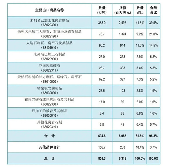 2021年石材http://www.stonebuy.com/出口http://en.stonebuy.com/主要目的地數量及貨值