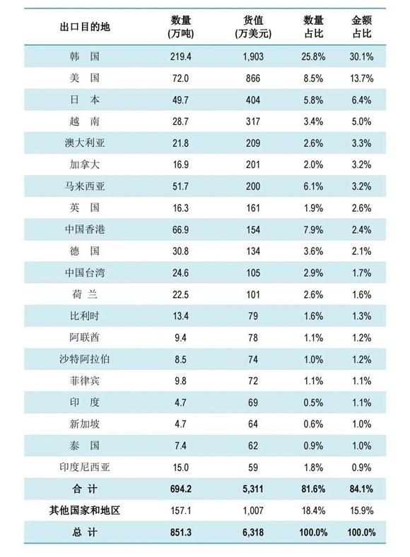 2021年,我國石材http://www.stonebuy.com/出口http://en.stonebuy.com/量為851.3萬噸,同比下降7.8%。其中,對韓國、美國、日本等20個主要石材http://www.stonebuy.com/出口http://en.stonebuy.com/目的地出口http://en.stonebuy.com/量合計下降3.4%,對他國家和地區出口http://en.stonebuy.com/量合計下降23.2%。(勘誤:下表中的貨值單位應為百萬美元)