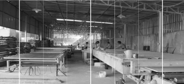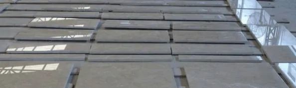 ④規(guī)格板切割好,完成防護(hù)后按拼接圖在地面鋪開排版,在公司特有的無直射光排版車間,進(jìn)一步調(diào)整色差。使顏色,紋路過渡自然,協(xié)調(diào)一致。