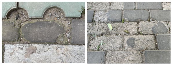 用“PC”磚鋪貼的市政道路可以說極其臟,嚴重影響了一個城市的市容市貌,不僅沒有起到裝飾城市的作用,相反使城市的市容市貌相當丑陋。圖5與圖6的“PC”磚能夠清洗干凈嗎?筆者認為是不可能的,即使可以清洗干凈其成本可能高于“PC”磚本身的價格了,意義不大了。
