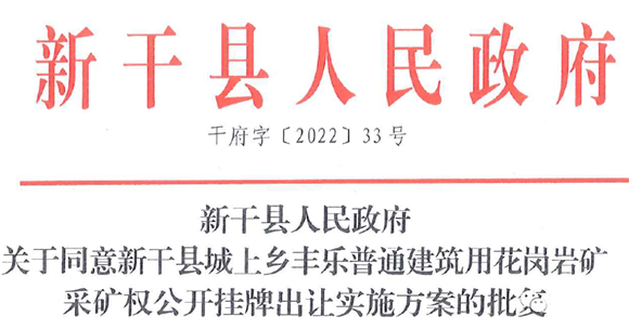 新干縣城上鄉豐樂普通建筑用花崗巖礦位于新干縣城110°方位直距約30公里處,行政區劃隸屬新干縣城上鄉管轄,礦區中心地理坐標:東經115°41′24″,北緯27°41′16″。開采標高:+435米至+160米;面積:0.4859平方公里;開采礦種:普通建筑用花崗巖;開采規模:600萬噸/年;開采年限:15.5年(含基建期1.5年);資源儲量:10593.699萬噸。起始價:11000萬元,(無底價掛牌)。