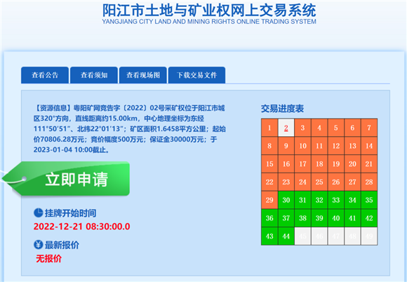 申請報(bào)名方式:申請人可于2022年12月21日8時(shí)30分至2023年1月3日16時(shí)前,競買申請人可通過互聯(lián)網(wǎng)登錄陽江市土地與礦業(yè)權(quán)網(wǎng)上交易系統(tǒng)(https://jy.yjggzy.cn:8087/)或廣東省公共資源交易平臺交易系統(tǒng)(https://ygp.gdzwfw.gov.cn/ggzy-portal/#/441700/jyxt)申請參加競買,交納競買保證金到賬截止時(shí)間為2023年1月3日16時(shí)0分。