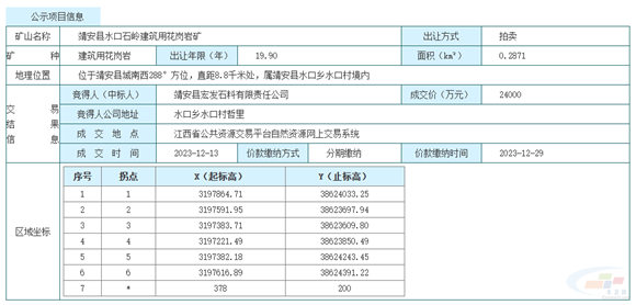 12月13日,靖安縣宏發石料有限責任公司以2.4億元競得江西省宜春市靖安縣水口石嶺建筑用花崗巖礦采礦權,起始價5100萬元,溢價18900萬元,溢價率370.59%。