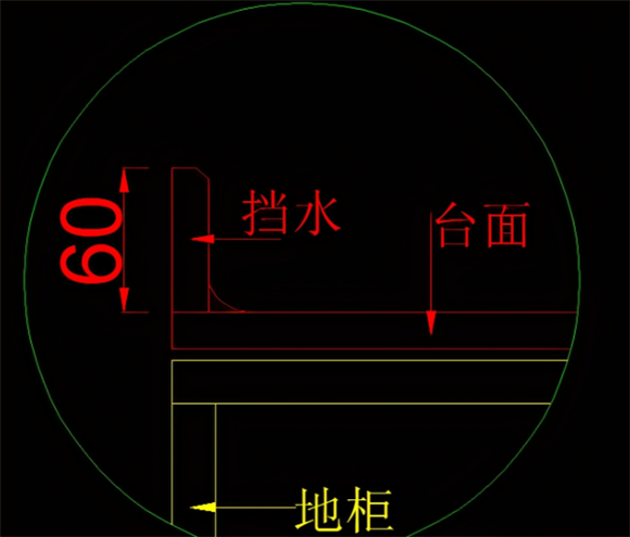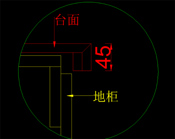首先我們來說說臺面的正面吊沿位置。這個位置的做法一般就兩種。方式一是直接轉45度角,方式二是在吊45mm的基礎上,在靠外邊口的位置單獨做一個小的弧形面。方式二主要是為了避免臺面上有水的時候順著臺面低落在地面或地柜上。不過現在做方式一的這種造型會更加的多一點。