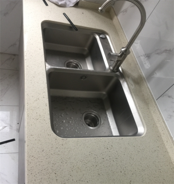 第二種,水槽和臺面基本齊平或水槽比臺面低1-2mm左右,就是我們一般說的臺中盆。這種方式就把水槽和臺面的縫隙留在了平面上,做了美縫的話后期會比第一種好得多,且可以很容易的將臺面的水漬或污漬清理到水槽中。