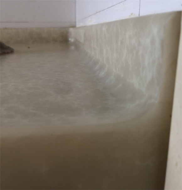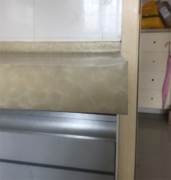第二種方式是在擋水和臺面間做了圓弧過渡面的,這種方式是需要在廠里就把擋水和臺面組合在一起,所以對現場量尺下單加工安裝的要求都比較高,而且由于墻面磚的不平整使得擋水和墻之間的縫隙會有明顯的差異,導致后期做了美縫也不是很美觀。所以現在的擋水條用第一種方式的比較多。