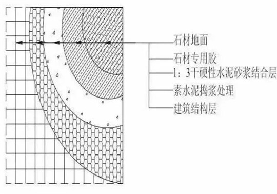 基層處理→水泥砂漿找平→找標高、定控制點、彈線→試拼和試排→鋪半干混凝土→石材http://www.stonebuy.com/鋪貼→擦縫、結晶處理→養護交工。