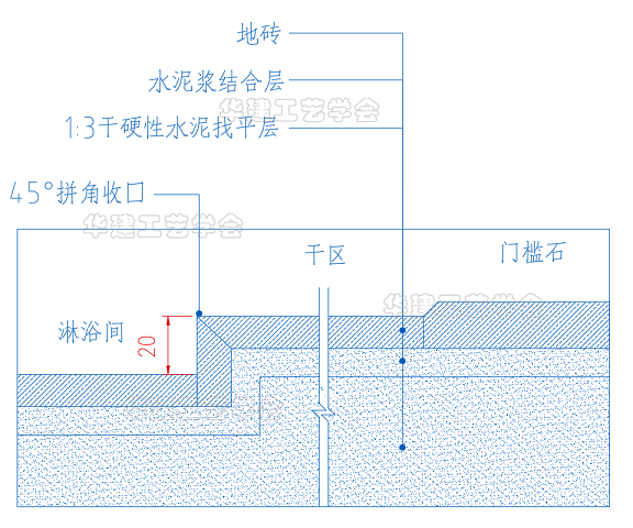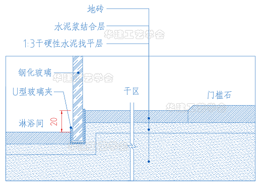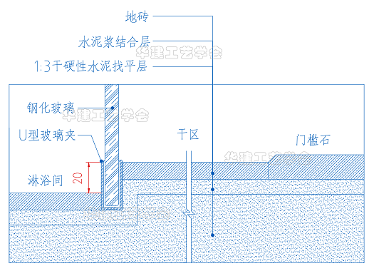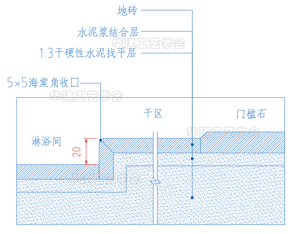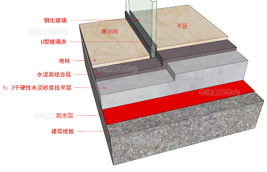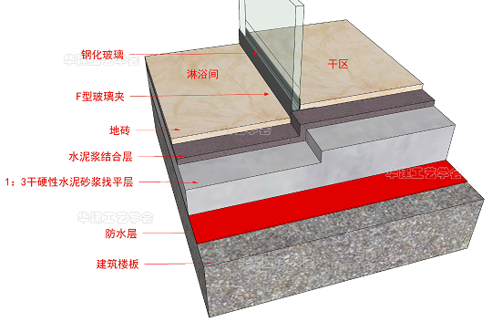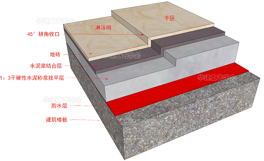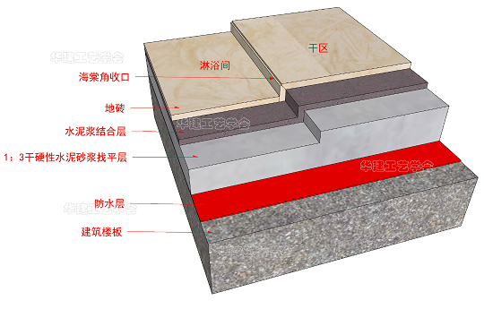 基層處理→防水涂料→滿鋪1:3干硬性水泥找平→水泥砂漿結合層→鋪貼瓷磚