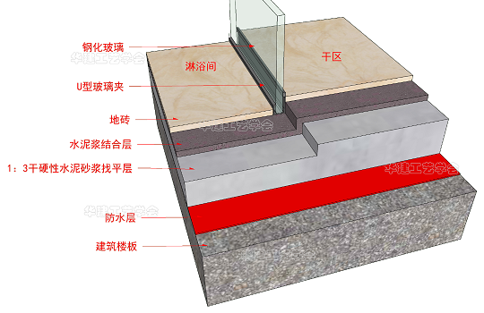 基層處理→防水涂料→1:3干硬性水泥找平→安裝玻璃金屬夾→背涂瓷磚膠→鋪貼瓷磚